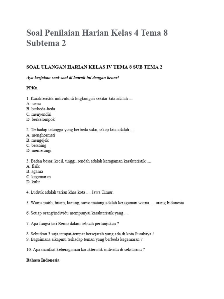 Artikel ini akan menjadi panduan lengkap bagi Anda, baik sebagai orang tua maupun pendidik, untuk memahami pentingnya Penilaian Harian, manfaat mengunduh soal-soal tersebut, serta cara efektif untuk mencarinya. Kita akan membahas berbagai platform, tips pencarian, hingga cara memanfaatkan soal-soal unduhan tersebut untuk memaksimalkan hasil belajar siswa.